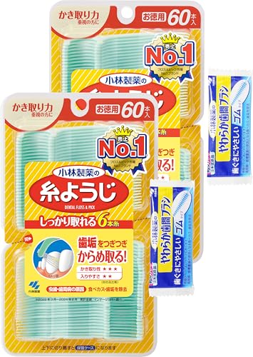 糸ようじ 【まとめ買い】小林製薬の フロス&ピック デンタルフロス 60本 歯間清掃 (やわらか歯間ブラシ試供品付き) ×2個 小林製薬 【Amazon.co.jp限定】